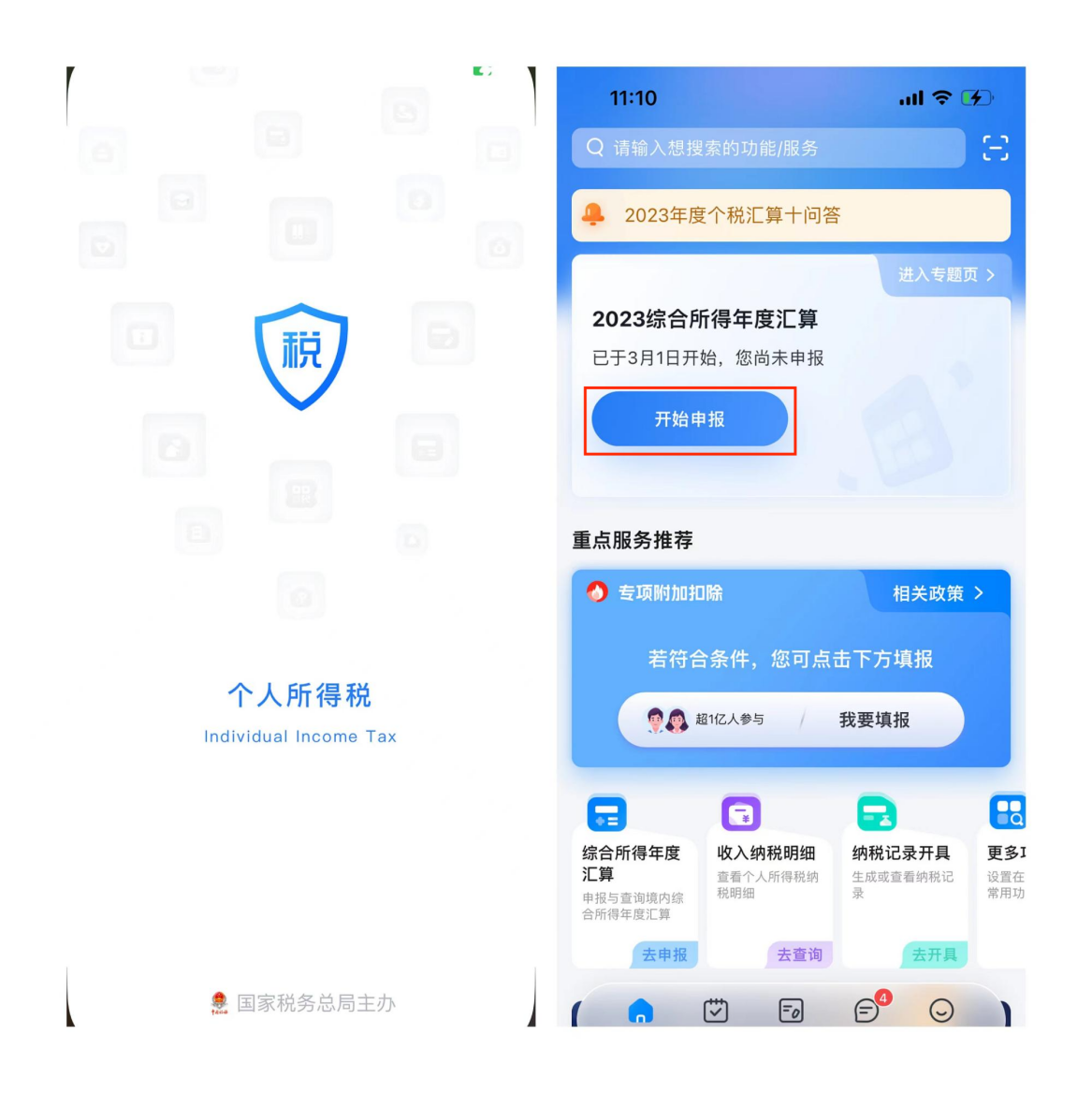 1、下载“个人所得税”APP,登陆个人账号。在“2023综合所得年度汇算”下方点击“开始申报”。